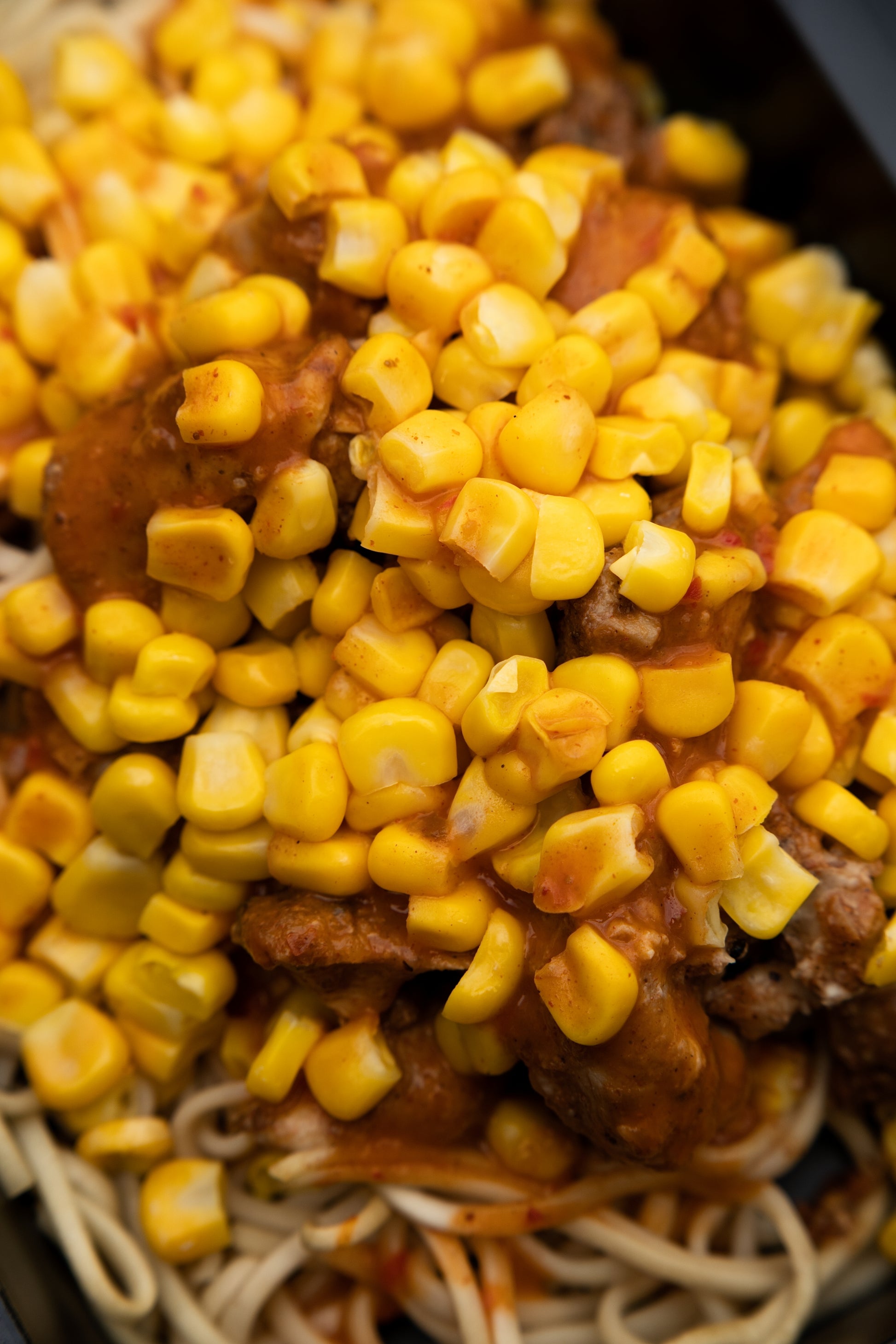 11. BBQ Chicken Thighs, Wholemeal Noodles, Sweetcorn, Piri Piri Sauce