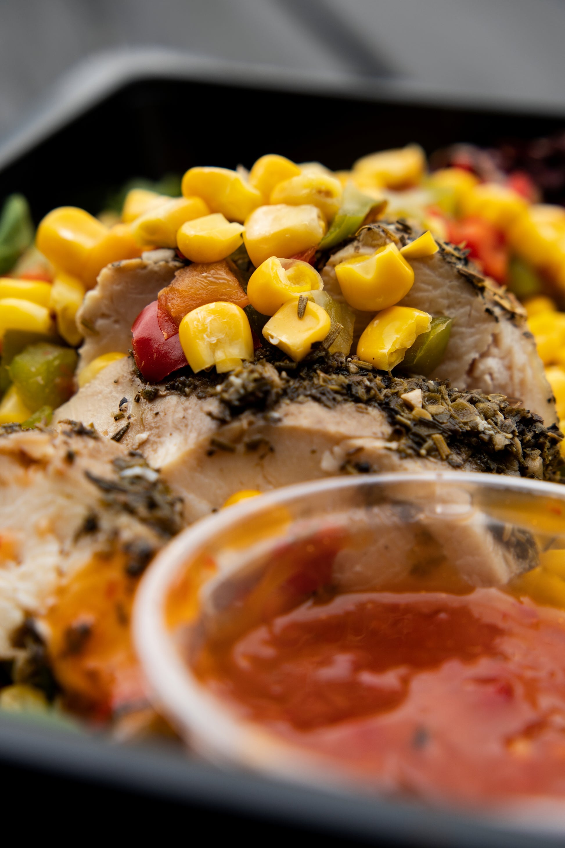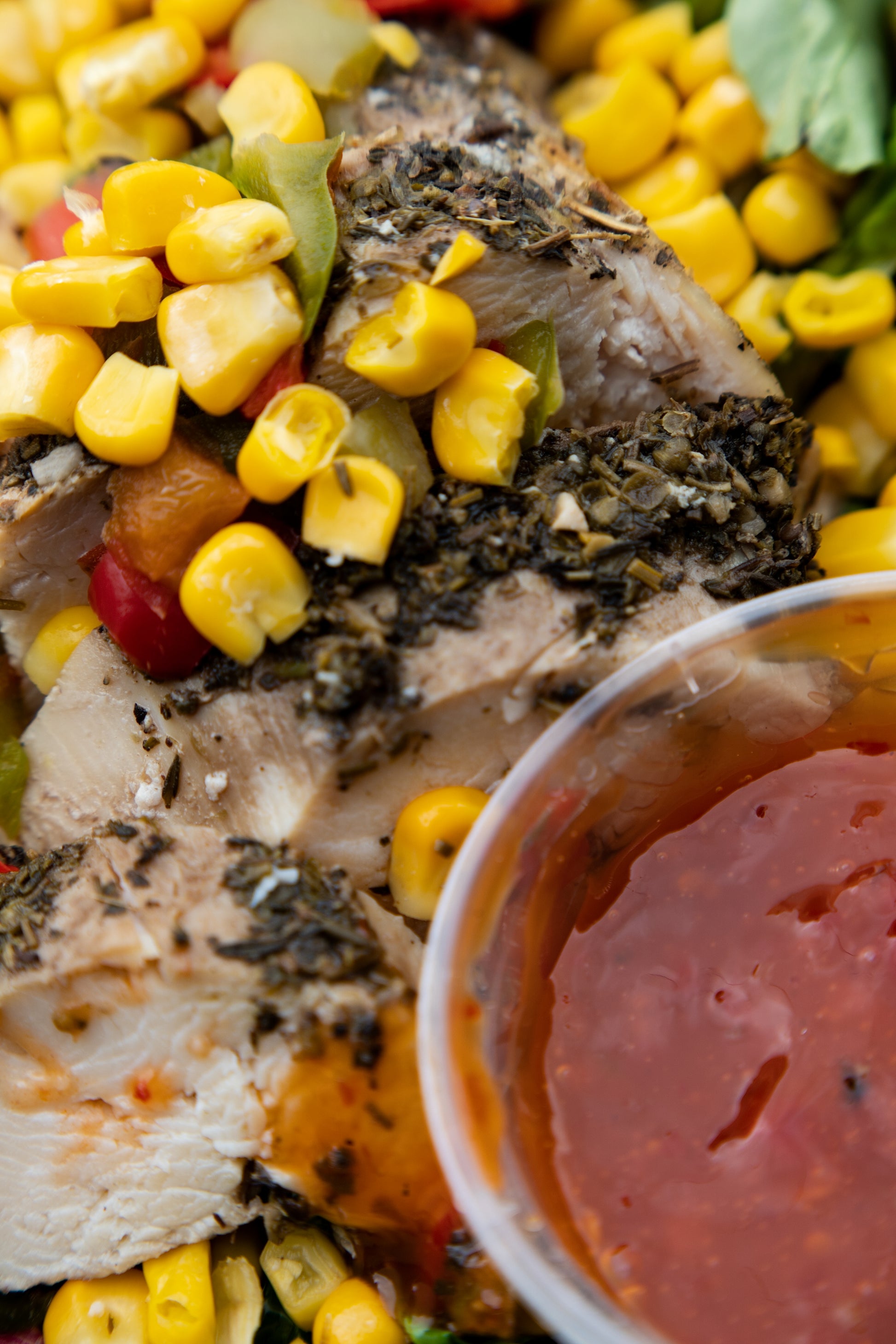 Salad Bag: mixed salad leaves in variable proportions: frisée, lambs lettuce, radicchio, Sweetcorn, Mixed Peppers: green pepper, red pepper, Chicken Breast: chicken 90%, water, sodium citrate, sodium carbonate, maltodextrin, salt, citrus fibre, italian seasoning: rosemary, dried basil, oregano, thyme, garlic powder, black pepper, Sweet Chilli: water, sugar, bell peppers, dried crushed chilli’s, salt, garlic puree, tomato paste