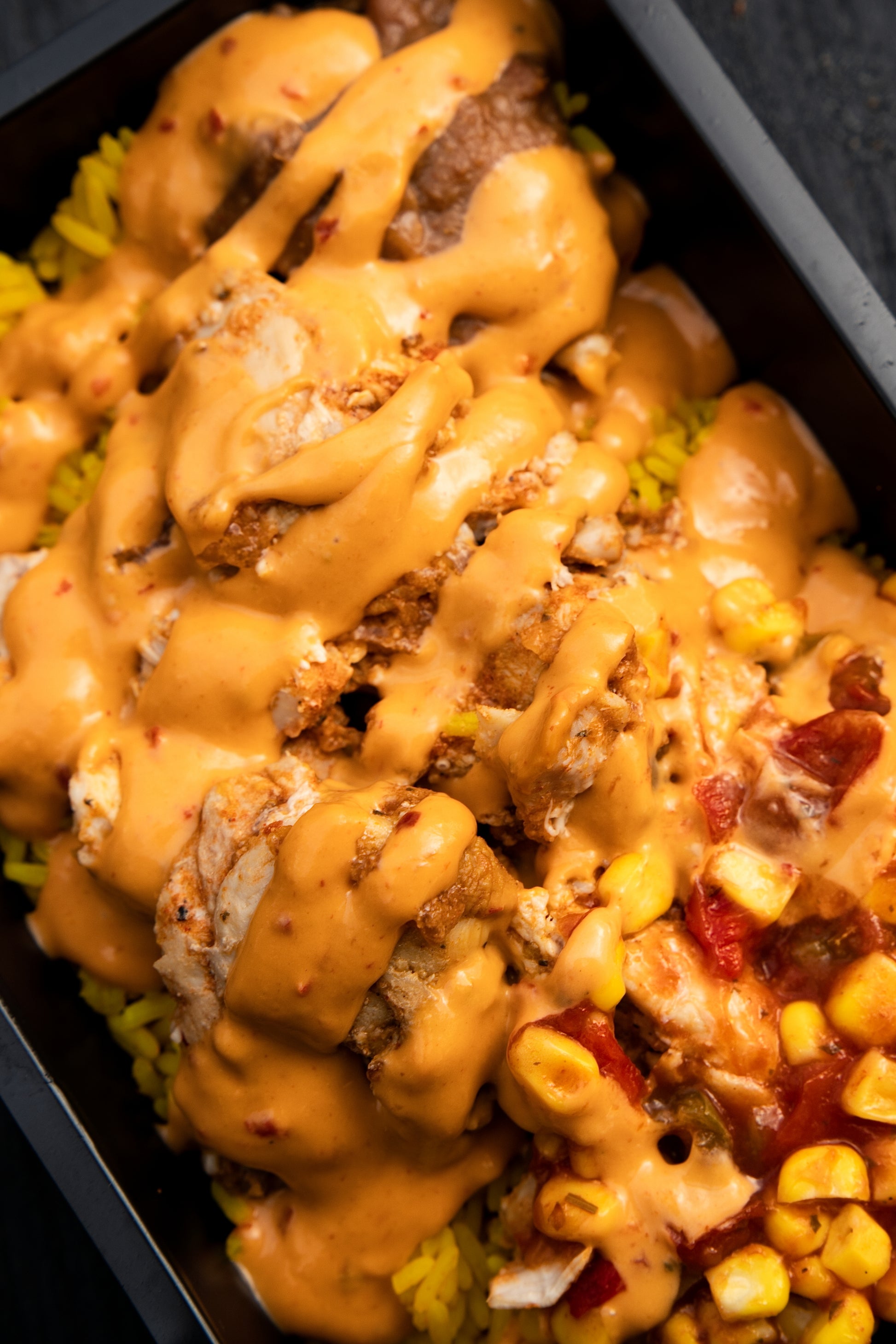 Fajita Chicken: skinless & boneless chicken thighs, salt, fajita seasoning: salt, paprika, sugar, dried onion, dried oregano, dried garlic, cinnamon powder, black pepper, garlic granules, chilli powder: dried chilli (62%), dried cayenne pepper (20%), dried cumin, dried oregano, salt, paprika, partially reconstituted tomatoe puree (41%), tomato (29%), water, sunflower oil, parsley, basil, dried onion, oregano, black pepper, Mexican Spicy Rice, basmati rice, ground turmeric, salt, chilli powder: dried chilli (62%), dried cayenne pepper (20%), dried cumin, Pico-De-Gallo: sweetcorn kernels, green pepper, red pepper, varying proportions, Italian sauce, garlic granules, Chipotle Mayo: water, sugar, rapeseed oil, chipotle chilli, paste(7%), red jalapeno peppers, smoked red jalapeños, peppers, green jalapeños peppers (6%), pasteurised EGG yolk powder, lemon juice from concentrate, tomato paste, dried red pepper, garlic puree, acidity regulator (acetic acid), tomato powder, chilli flakes, smoke flavouring, paprika extract, sweetener (sucralose), cayenne pepper