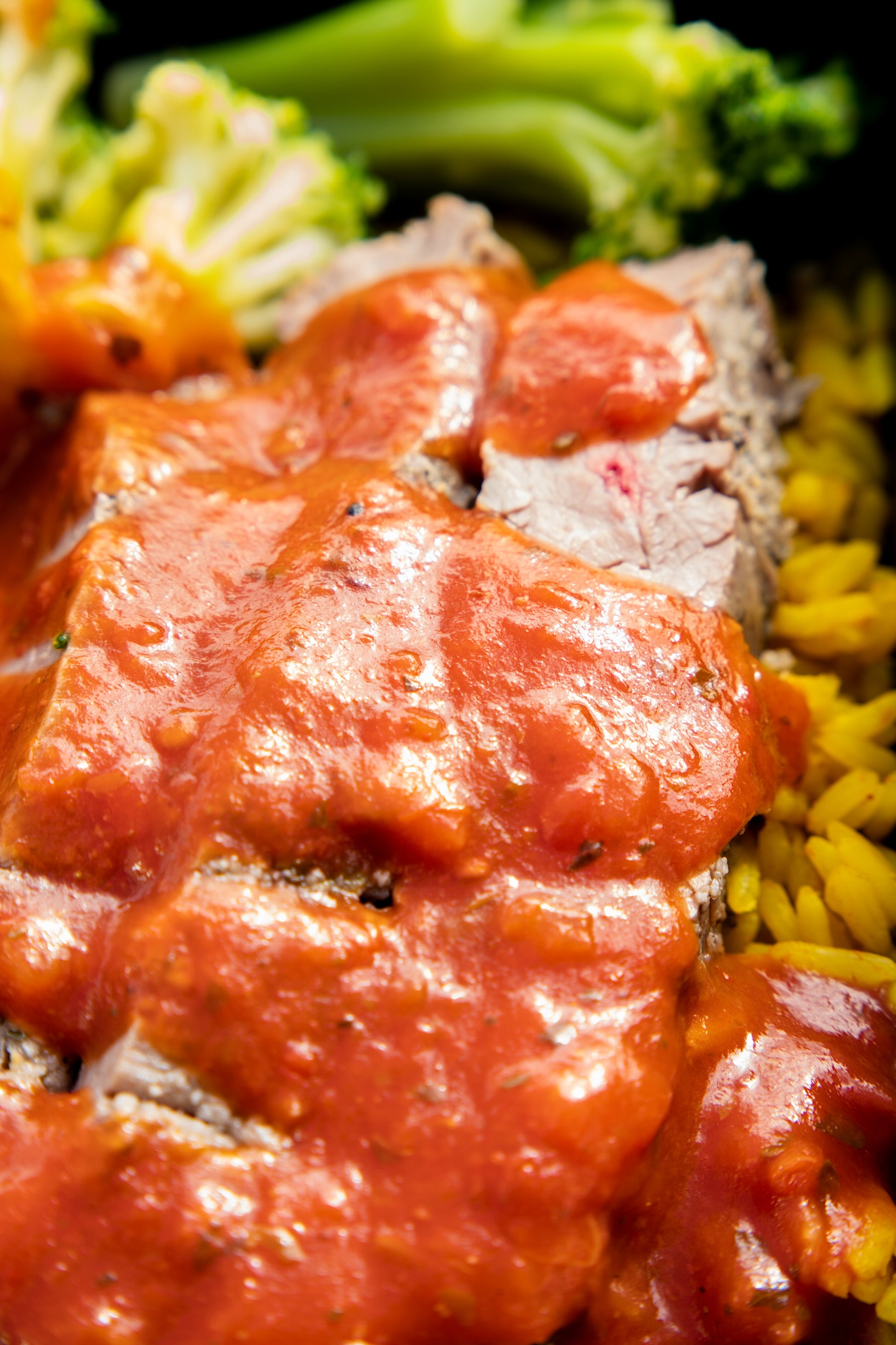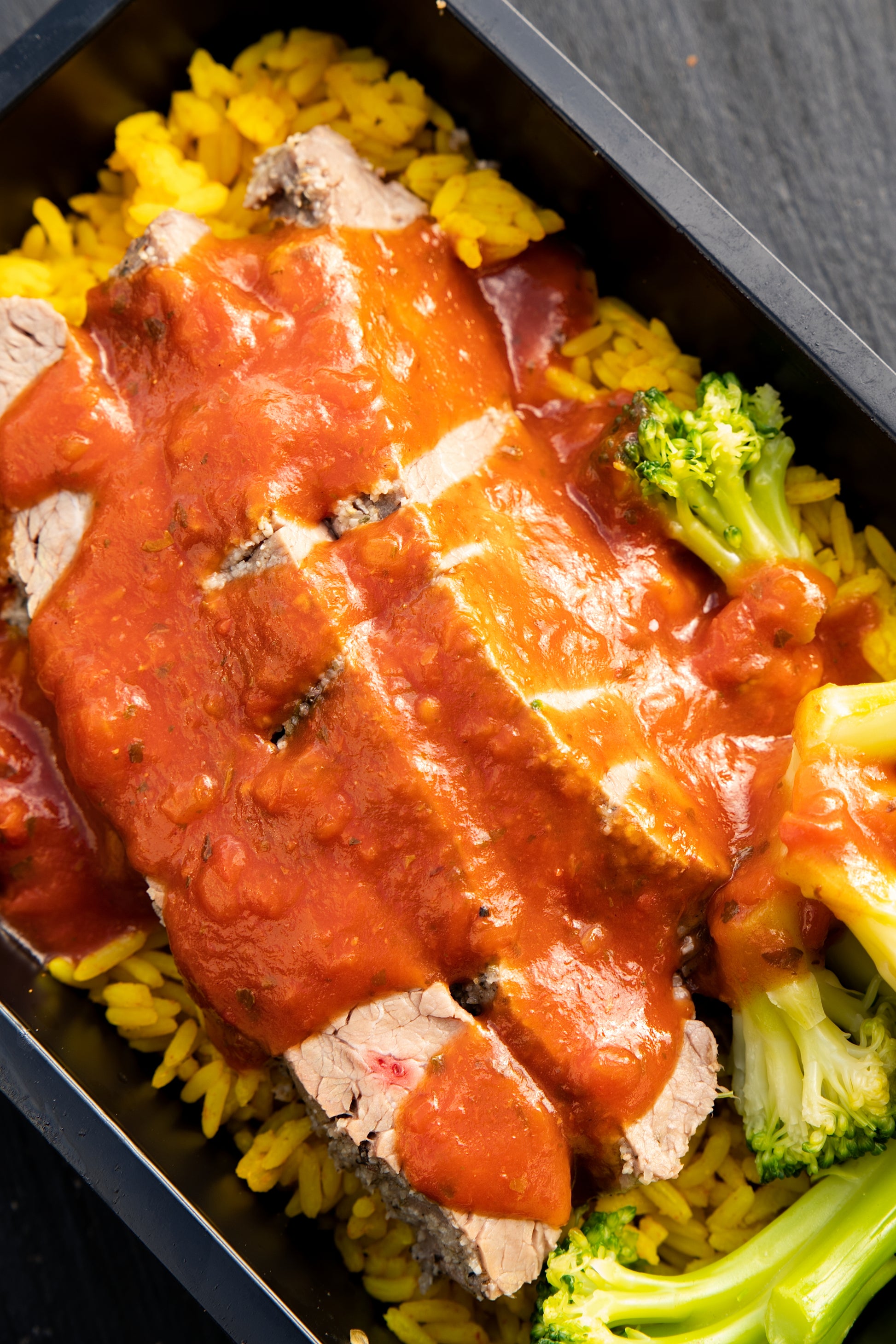 8. Steak Strips, Mexican Spicy Rice, Broccoli, Italian Sauce